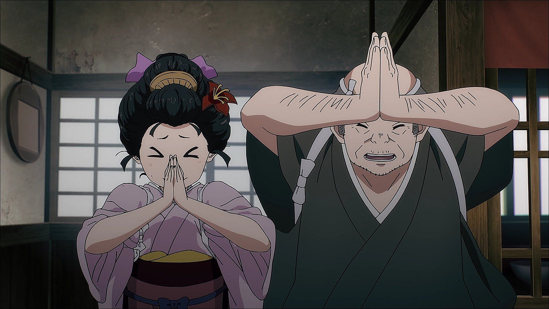 Sword of the Demon Hunter episode 5 then cuts to Natsu exiting Ofuu's Soba restaurant only to stumble onto a samurai. Given the usual short tempers and rather pompous disposition of samurais, Natsu starts apologizing vehemently, unsure of her fate, which rested completely in the samurai's hands.