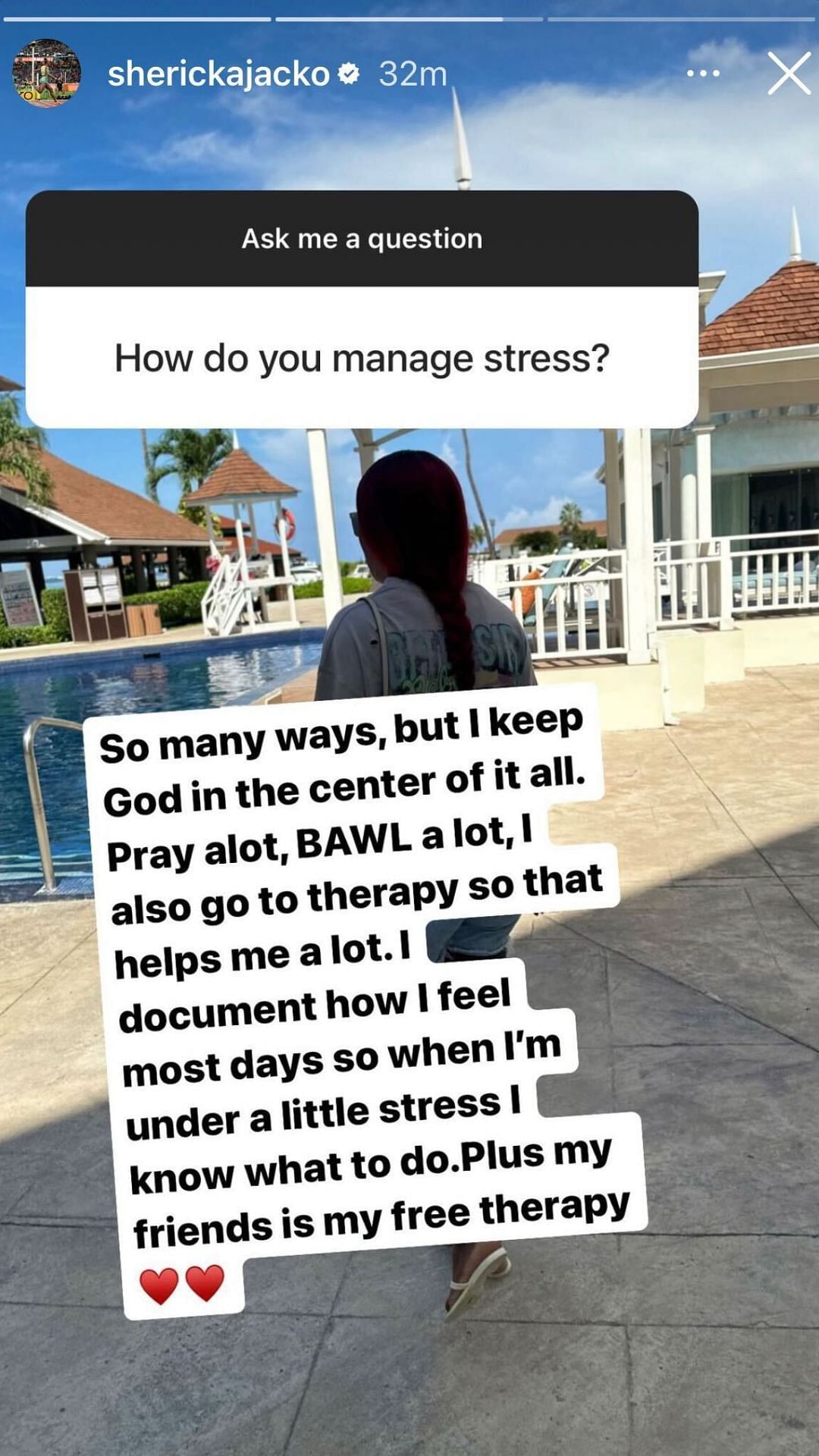 “So many ways but I keep God in the centre of it all. Pray a lot, BAWL a lot, I also go to so that helps me a lot. I document how I feel most days so when I'm under a little stress I know what to do. Plus my friends is my free therapy” Shericka Jackson wrote along with a red heart emoji.