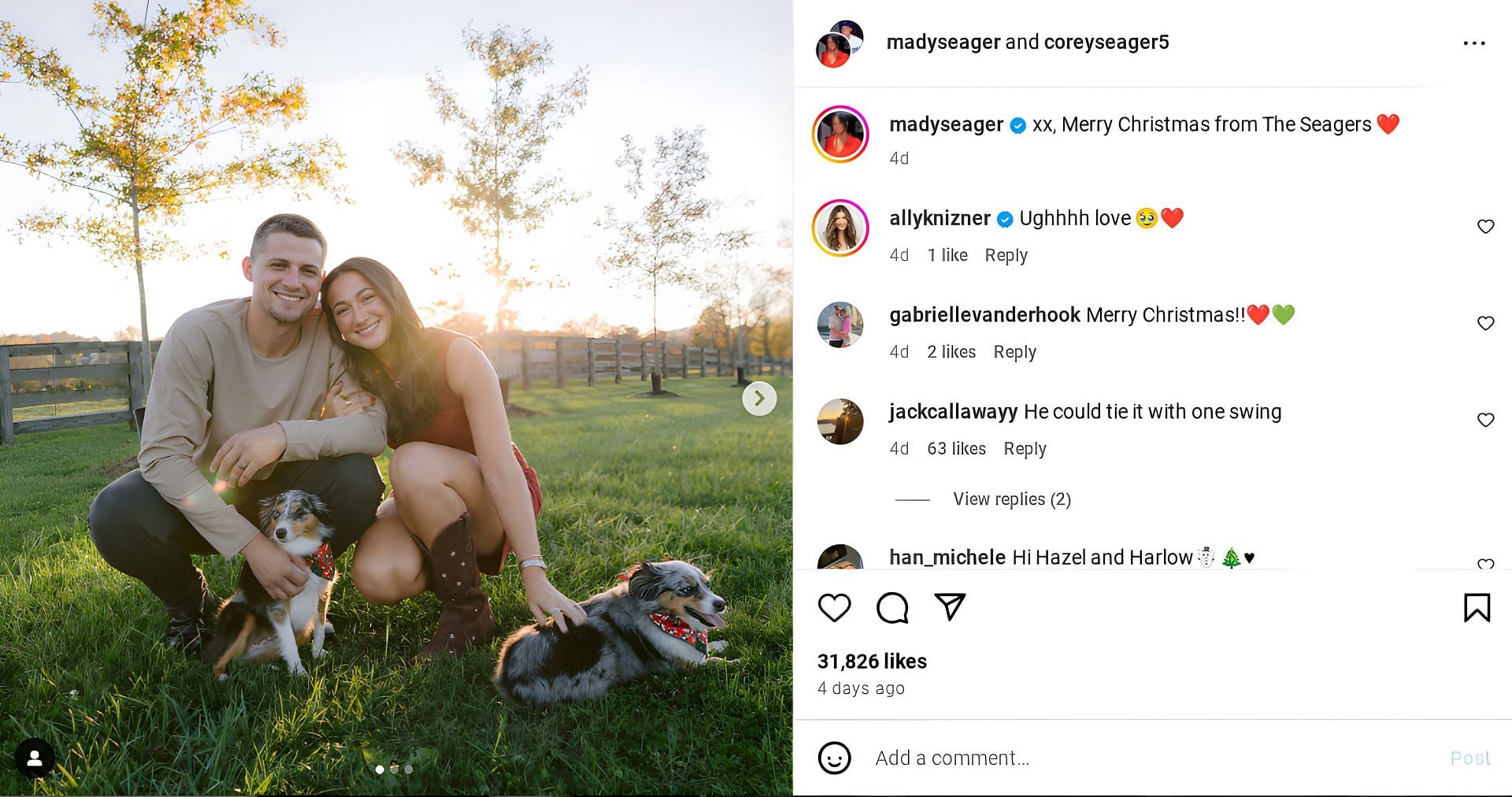 Madisyn and Corey Seager were posing with their two dogs for the picture that became the holiday post for the family. The caption on the Instagram post read: