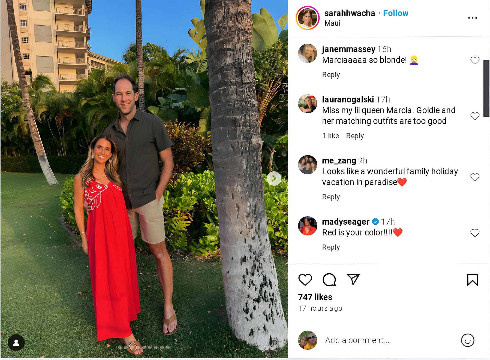 On Saturday, Corey Seager's wife Madisyn reacted to the latest post from Sarah, the wife of Michael Wacha. Sarah posted a photo in Hawaii with her husband. She was wearing a long summer dress alongside Michael, who wearing a button-down shirt and khaki shorts.