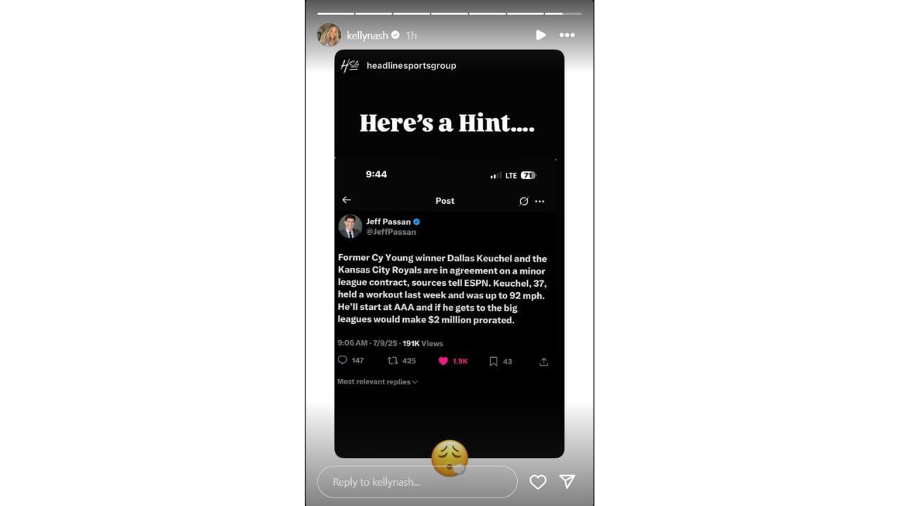 Just hours after ESPN’s Jeff Passan broke the news that Keuchel had signed a minor league deal with the Royals, Nash posted a social media story featuring the headline and a cryptic three-word caption: