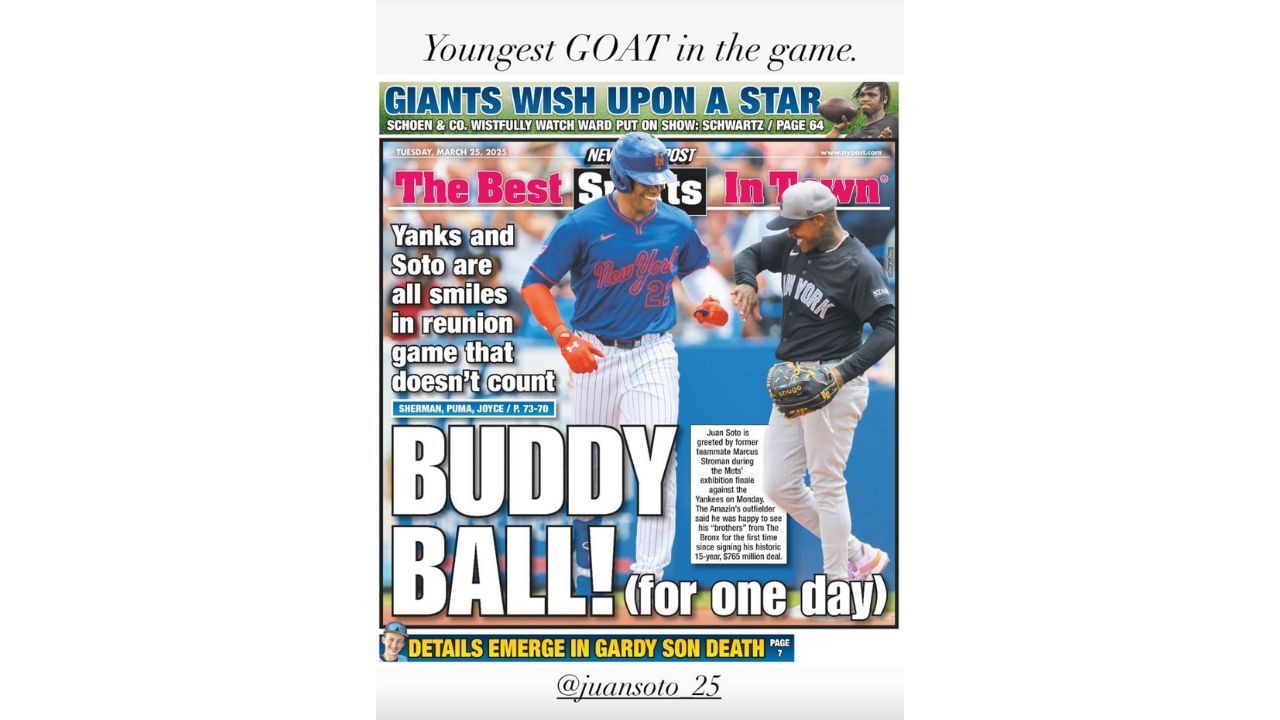There is no ill will on Stroman's part, as he called Soto the "youngest GOAT in the game." The pair matched up twice in the spring game, with Soto failing to get the best of his ex-mate.