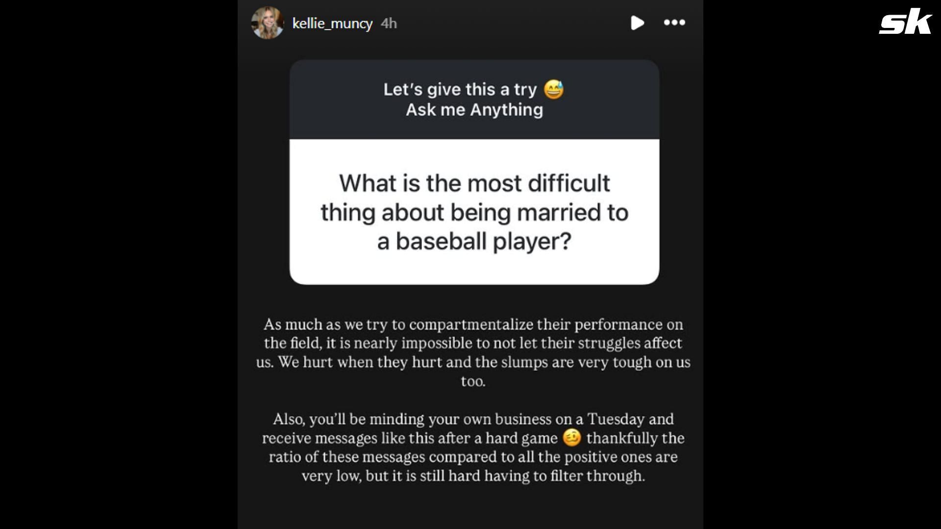 On Friday, one Instagram user asked Kellie to reflect on the challenges of being married to a baseball player. She responded: