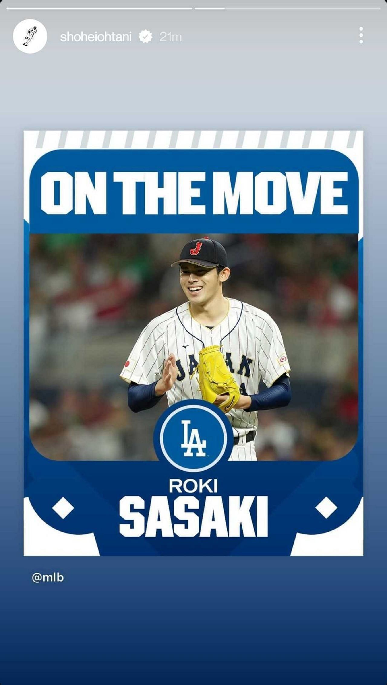 Shohei Ohtani posted a couple of updates on his Instagram story welcoming Roki Sasaki to the LA Dodgers as he joins a vaunted starting rotation of the reigning World Series champions, which features Yoshinobu Yamamoto and Blake Snell.
