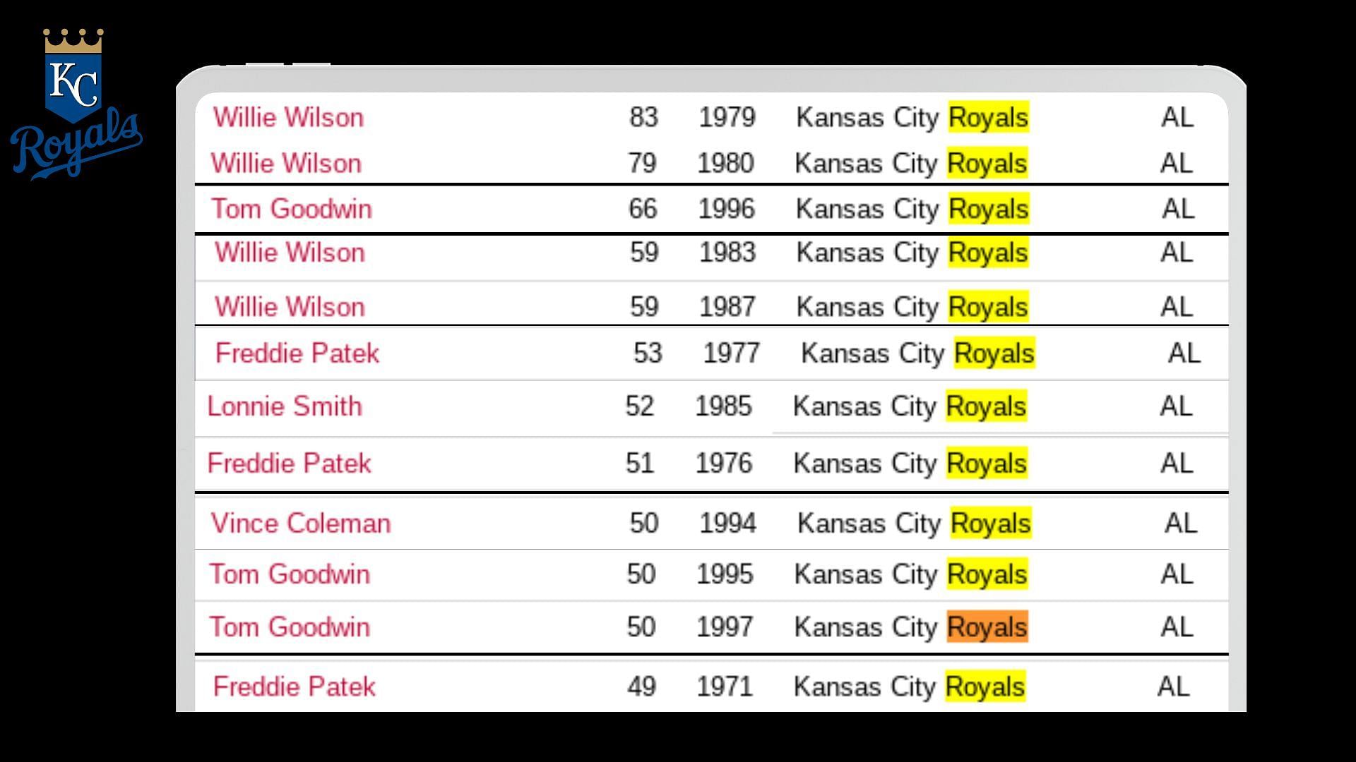 Former Kansas City Royals outfielder Willie Wilson secured his place in franchise history as the undisputed stolen base leader in a single season. With a staggering 83 stolen bases to his name, Wilson stands atop the list, leaving an indelible mark on the Royals' record books.