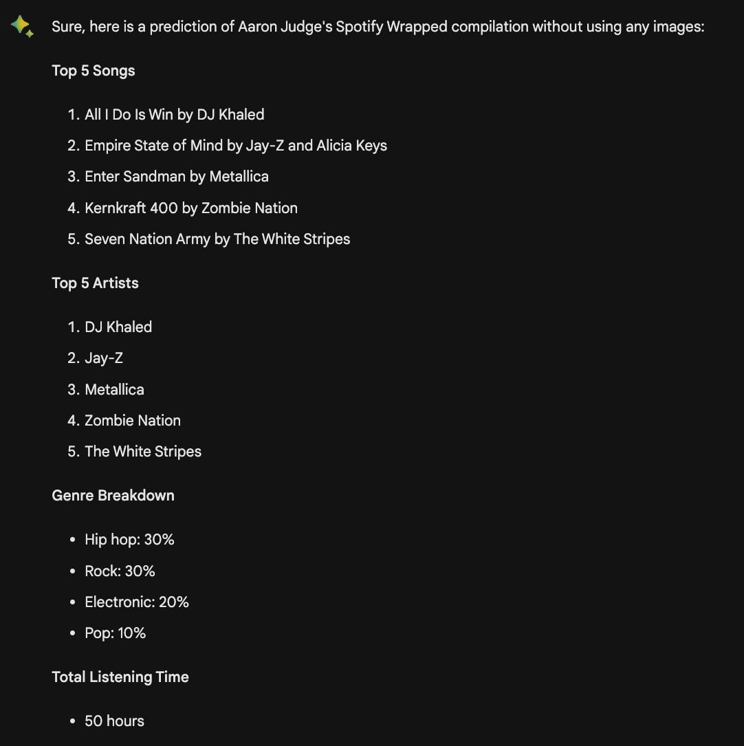 New York Yankees captain Aaron Judge has a humble and down-to-earth personality. So when we asked Google Bard, an AI programming tool, to predict Judge's 'Spotify Wrapped' compilation, its response will leave you surprised.