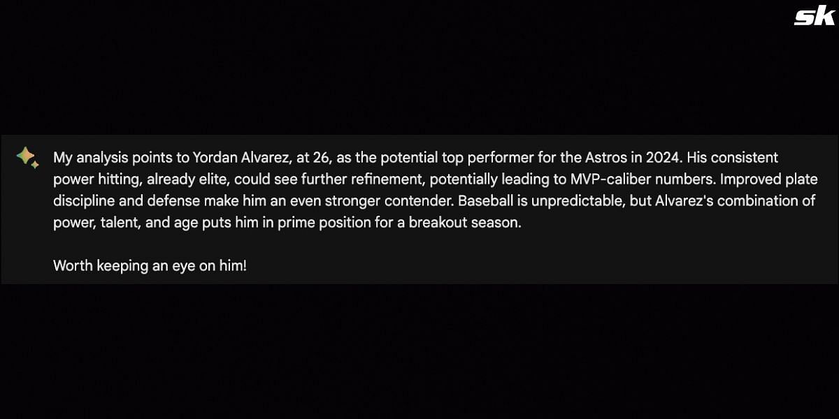 When we asked Google Bard to predict the best performer for the Houston Astros for the 2024 season, Bard picked left-handed hitter Yordan Alvarez. Adding more to it, the AI pointed out that his consistent power-hitting, plate discipline and defense could propel him to MVP honors this season.