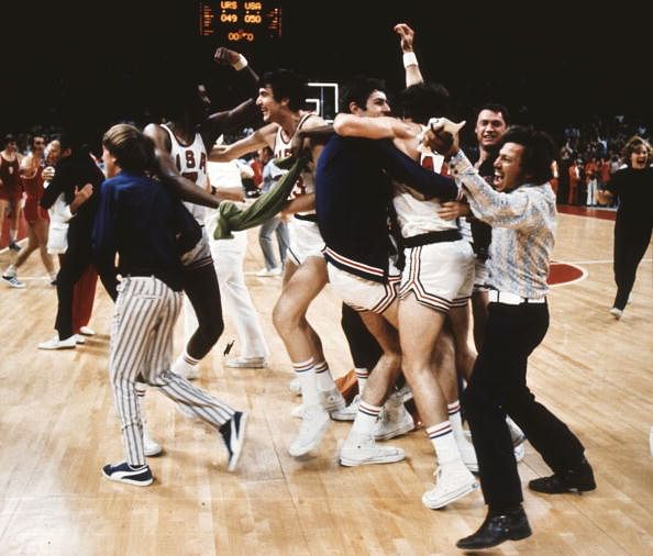 MUNICH, GERMANY: The US basketball players jubilate 09 September 1972 for a short moment as they mistakenly celebrate what they thought was a victory over Soviet Union in the final game of the Olympic basketball tournament in Munich.