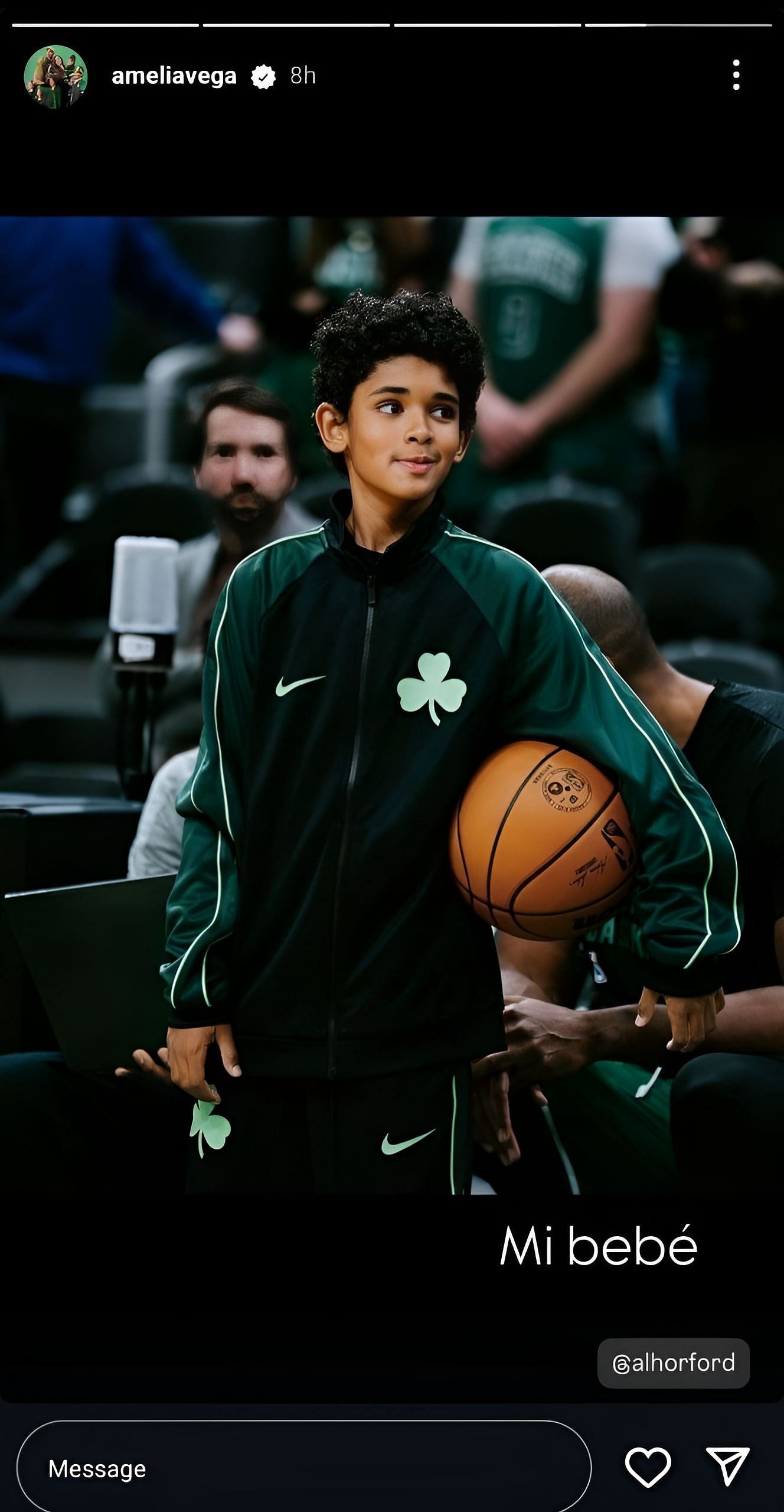 Al Horford’s wife, Amelia Vega, took pride in how their son, Ean, had grown up. Vega showed off her son in the Boston Celtics’ practice gear while casually holding an NBA ball on Sunday.