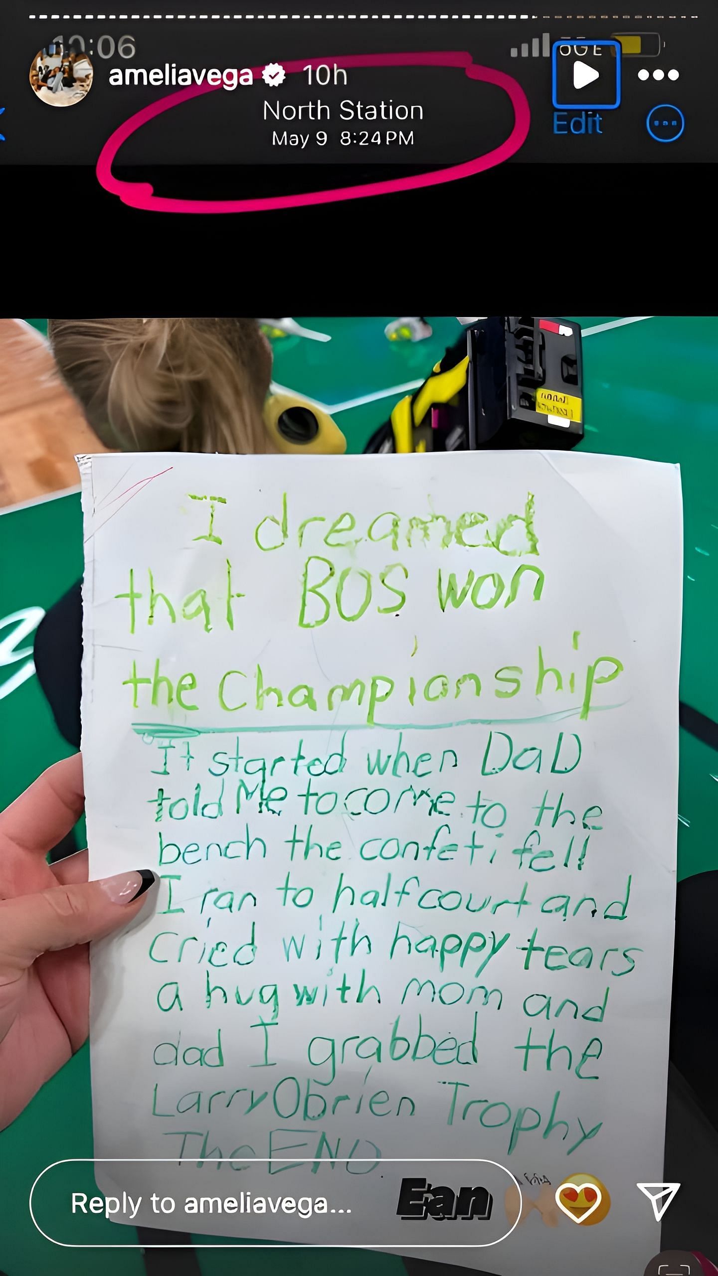 “I dreamed that Bos won championship. It started when DAD told me to come to bench the confetti fell I ran to half court and cried with happy tears a hug with mom and dad I grabbed the Larry O’Brian Trophy. The END,” Ean wrote on the paper.