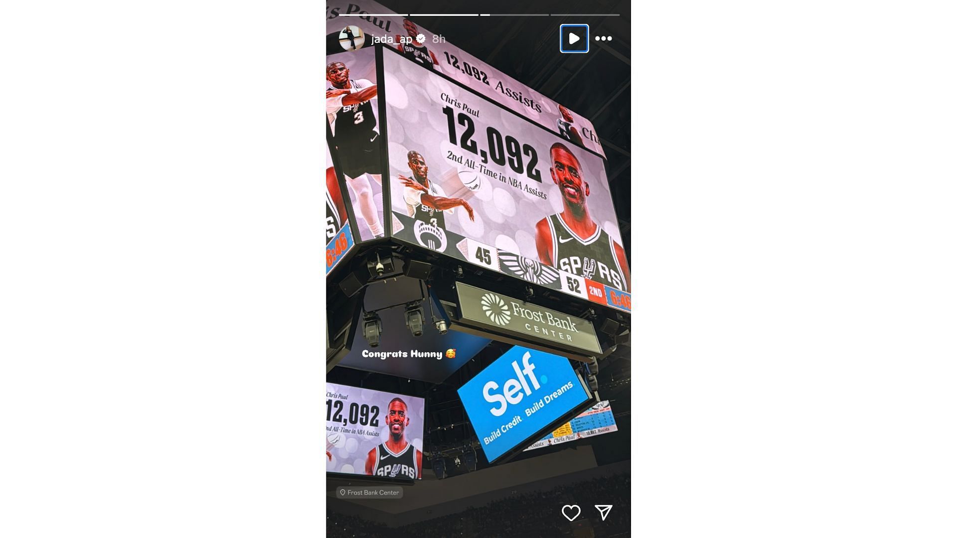 Following the historic feat, the NBA star received a touching message of support from his wife, Jada Paul. She shared an image on her Instagram account of the big screen at the Frost Bank Center congratulating the point guard after he reached the 12,092 assists mark. She added a succinct two-word message in support of her husband.
