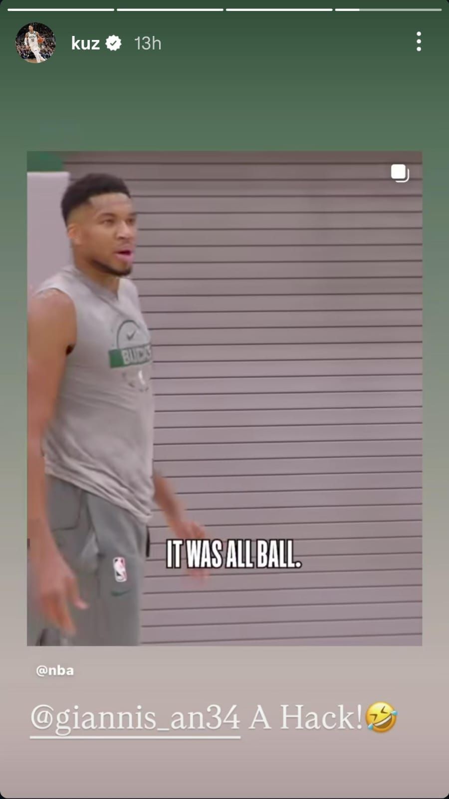 Kuzma reposted the footage on his Instagram account and poked fun at Antetokounmpo, calling him a "hack".