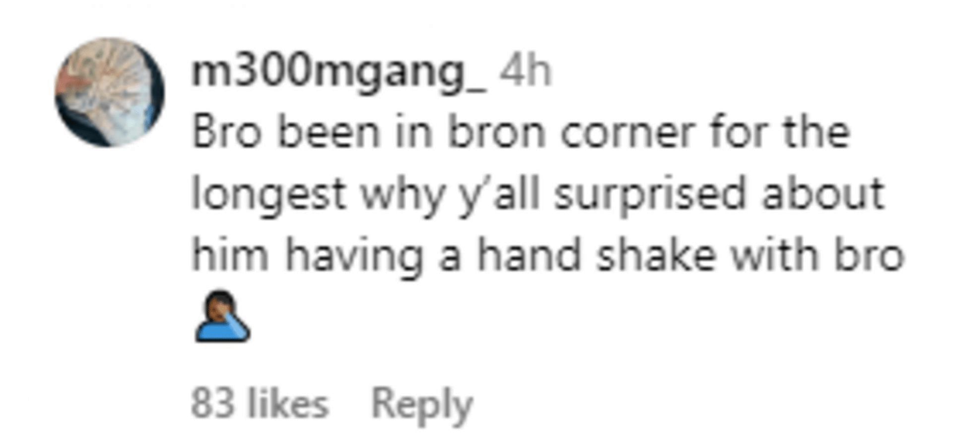 "Bro been in bron corner for the longest why y’all surprised about him having a hand shake with bro"