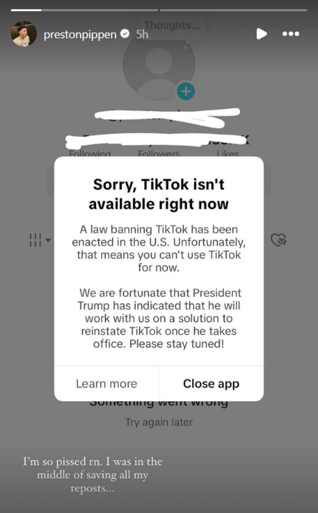 Following the TikTok blackout in the U.S. on Saturday, which started shortly before its ban was due to take effect, NBA legend Scottie Pippen's son, Preston Pippen, vented his frustration over the issue. Preston shared a screenshot of TikTok's unavailability message on Instagram while revealing that he was in the middle of saving his reposts on the app when the blackout began.