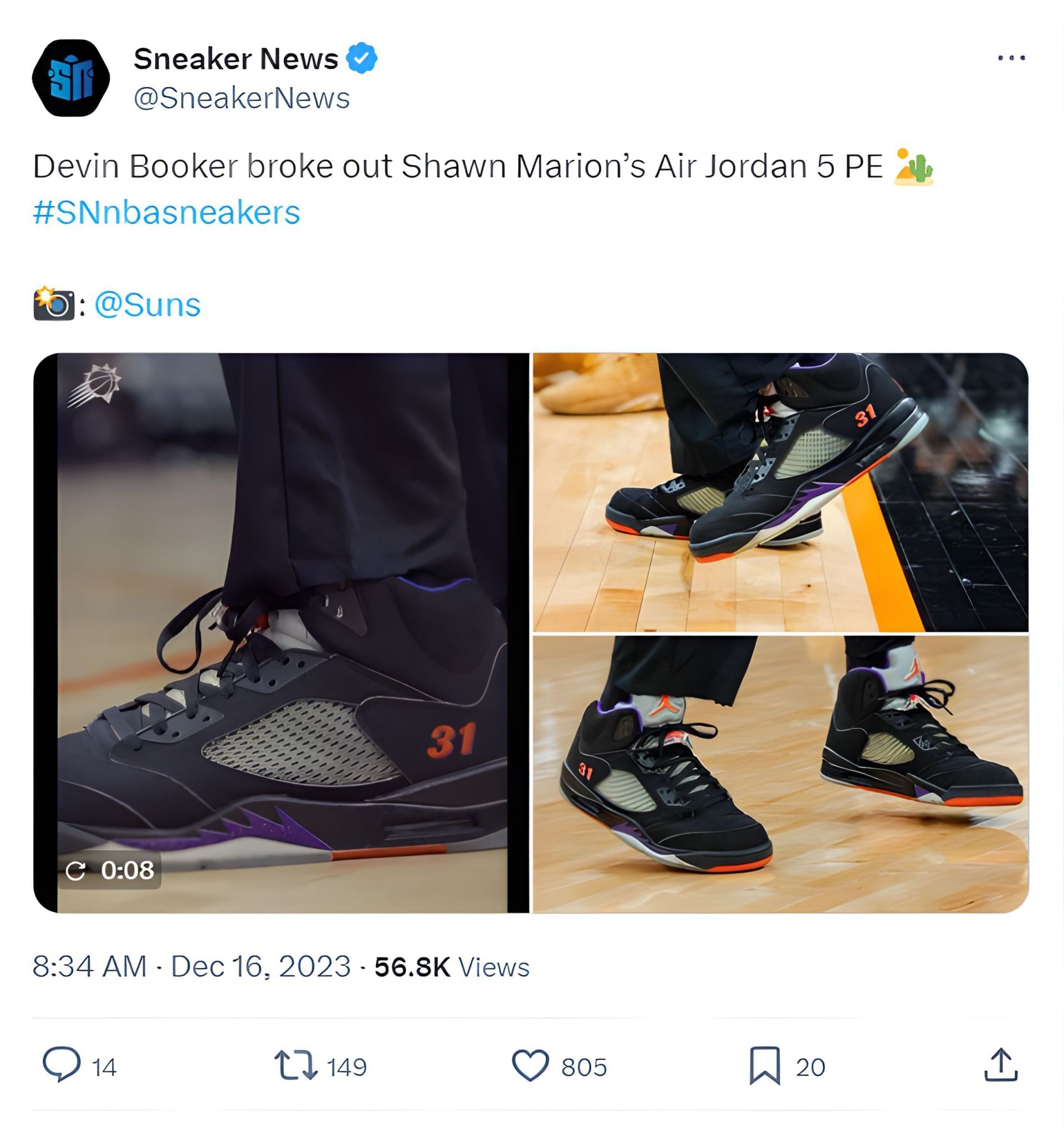 In a night filled with nostalgia and honor, Phoenix Suns' star Devin Booker paid a unique tribute to Shawn Marion, affectionately known as "The Matrix". As Marion was inducted into the Suns' "Ring of Honor" on December 15, 2023, Booker chose to commemorate the occasion by donning Marion's rare Air Jordan 5 Player Exclusives (PE).