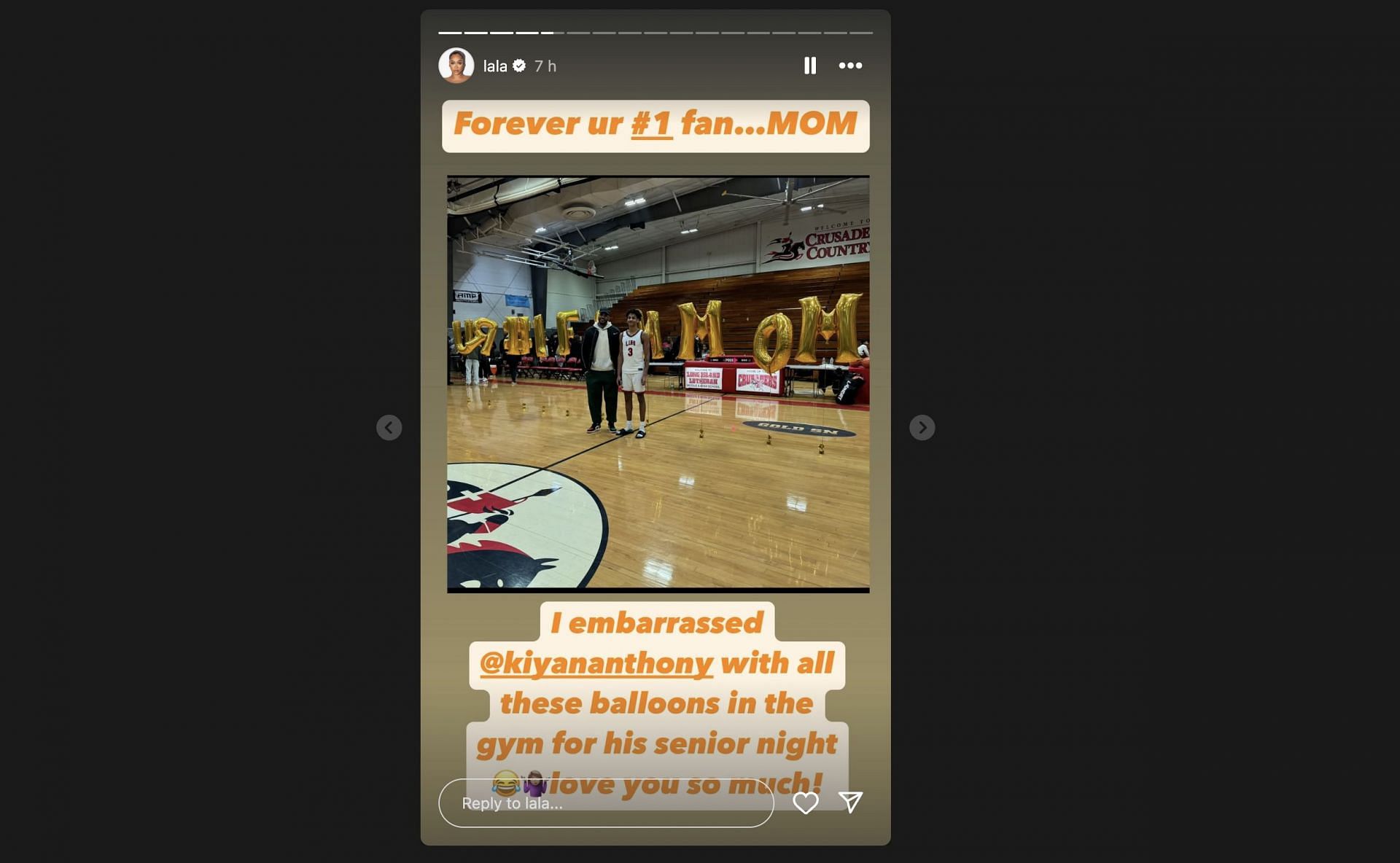 After Kiyan played his senior night game for the Long Island Lutheran vs. IMG Academy, the gym was decorated with balloons by La La. Carmelo Anthony was also in attendance. La La posted a pic of the father-son duo with the balloons in the background, captioning the post: