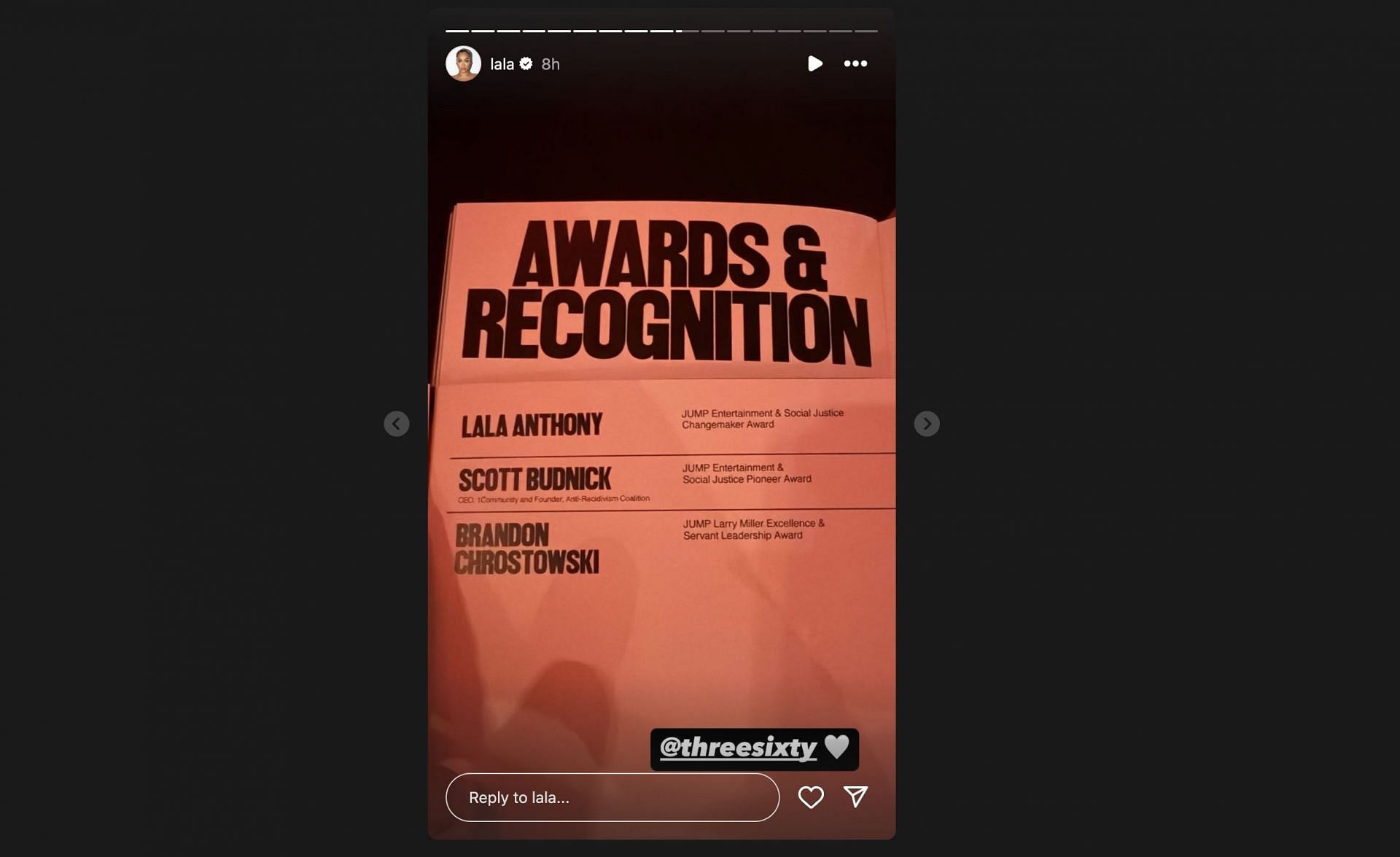 La La Anthony couldn't attend his senior night as she was invited to the NBA All-Star weekend in San Francisco. She represented her foundation, "ThreeSixty." La La was honored with JUMP's (Justice & Upward Mobility Project) Entertainment and Social Justice Changemaker award.