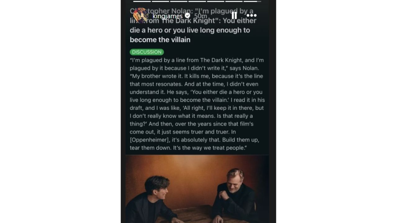 LeBron James used the quote on "The Dark Knight" for his cryptic message on IG. While that already gives a hint of what he wanted to send, the way Christopher Nolan described Oppenheimer might be what he was alluding to.