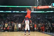 John Wall #2 of the Washington Wizards dunks over the Wizards mascot during the Sprite Slam Dunk Contest on State Farm All-Star Saturday Night as part of the 2014 All-Star Weekend at Smoothie King Center on February 15, 2014 in New Orleans, Louisiana.