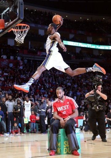Jeremy Evans during the Slam Dunk Contest as part of the All-Star Weekend on February 16, 2013. Evans opened with a windmill dunk over a covered painting, then lifted the cover to reveal his own painting of the dunk he had just performed.