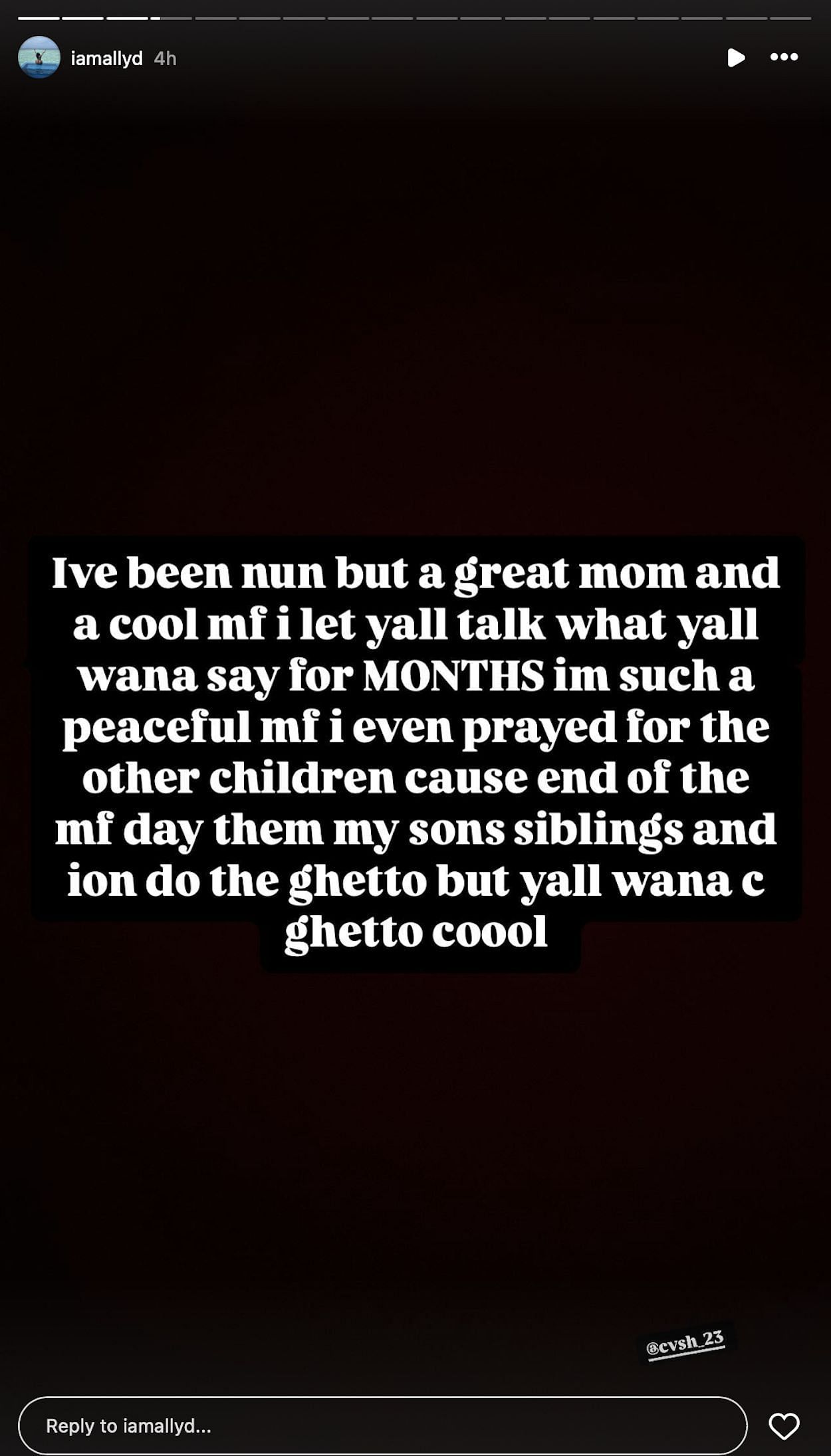 "I've been nun but a great mom and a cool mf I let yall talk what yall wana say for MONTHS im such a peaceful mf i even prayed for the other children cause end of the mf day them my sons siblings and ion do the ghetto but yall wana c ghetto coool"