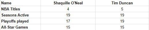 While Shaq's threepeating peak with the Lakers is right up there among the best peak performances by a player in the playoffs, Duncan's peak of leading the Spurs to four titles in nine seasons is an achievement on pretty much the same level - every Finals series from 1999 to 2007 involved one of these two big men.