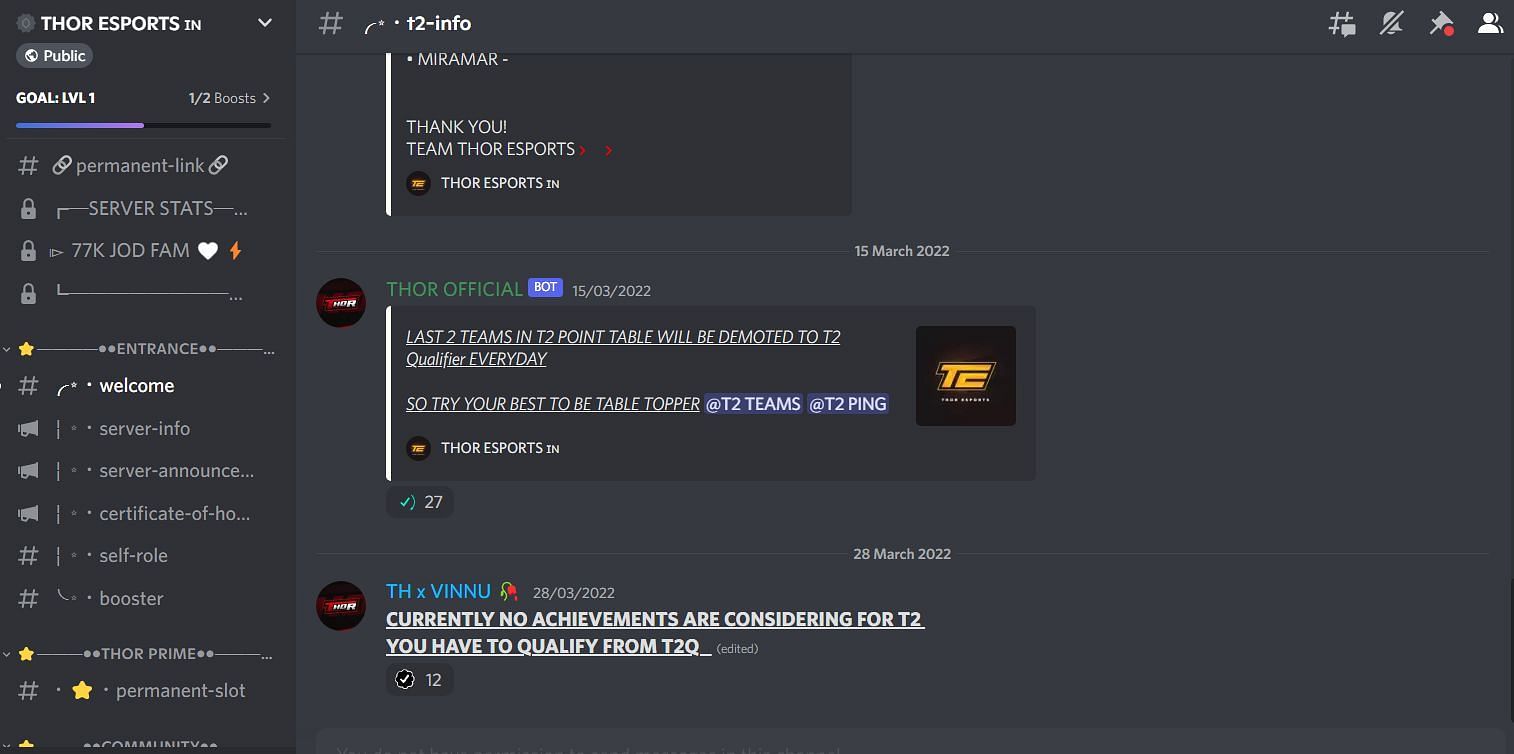 Thor Esports IN is among the best Discord servers in India for Battlegrounds Mobile India competitions. The Discord server offers various options for pro players to feature in Tier 3 and Tier 2 Battlegrounds Mobile India scrims. However, there aren't many options for T1 tournaments, so players will have to consider the next Discord server.