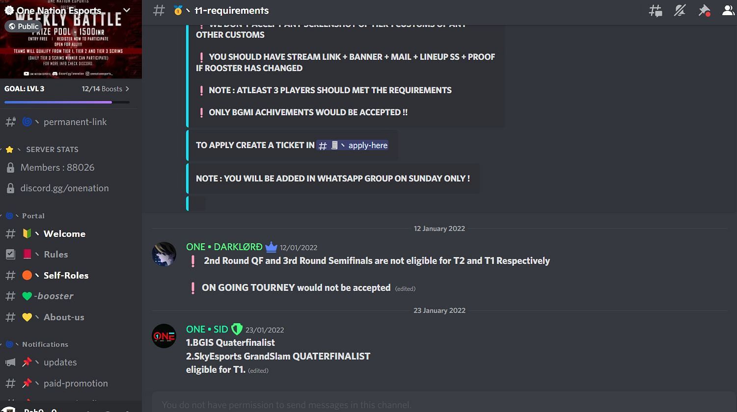 Unlike the previous two servers, One Nation Esports primarily focuses on the competitive scene. The server is still in the growing phase but is already providing members access to an array of channels for T3 scrims, and users may also spot T2 and T1 options in some channels.