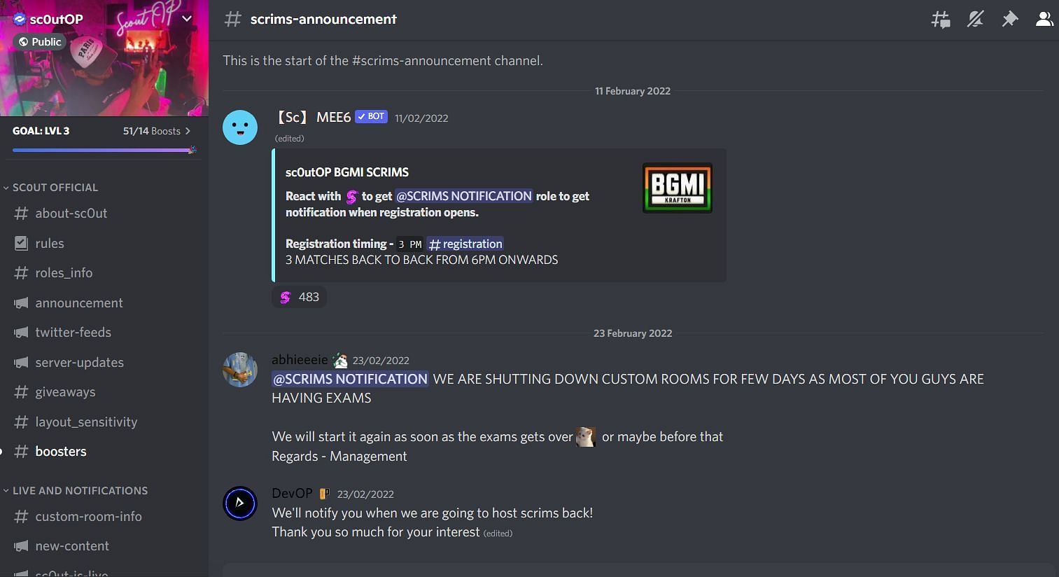 Also known as sc0utOP, Tanmay's channel has a Discord server (arguably the biggest server in India) featuring esports content for Battlegrounds Mobile India. Players who want to start in the esports scene in India can access the scrims available on one of the channels.