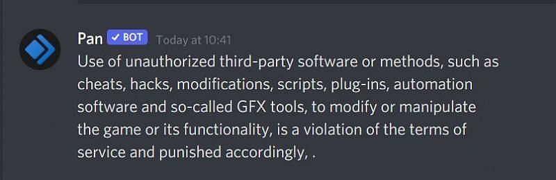 “Use of unauthorized third-party software or methods, such as cheats, hacks, modifications, scripts, plug-ins, automation software and so-called GFX tools, to modify or manipulate the game or its functionality, is a violation of the terms of service and punished accordingly,”