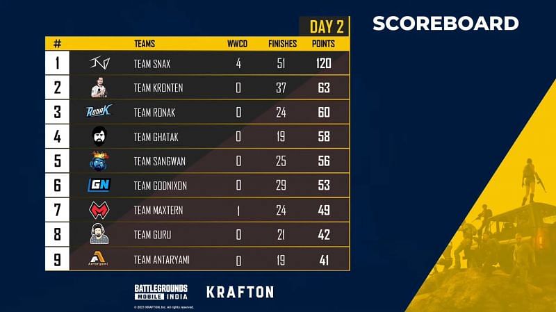 Battlegrounds Mobile India The Launch Party Day 2 overall standings
