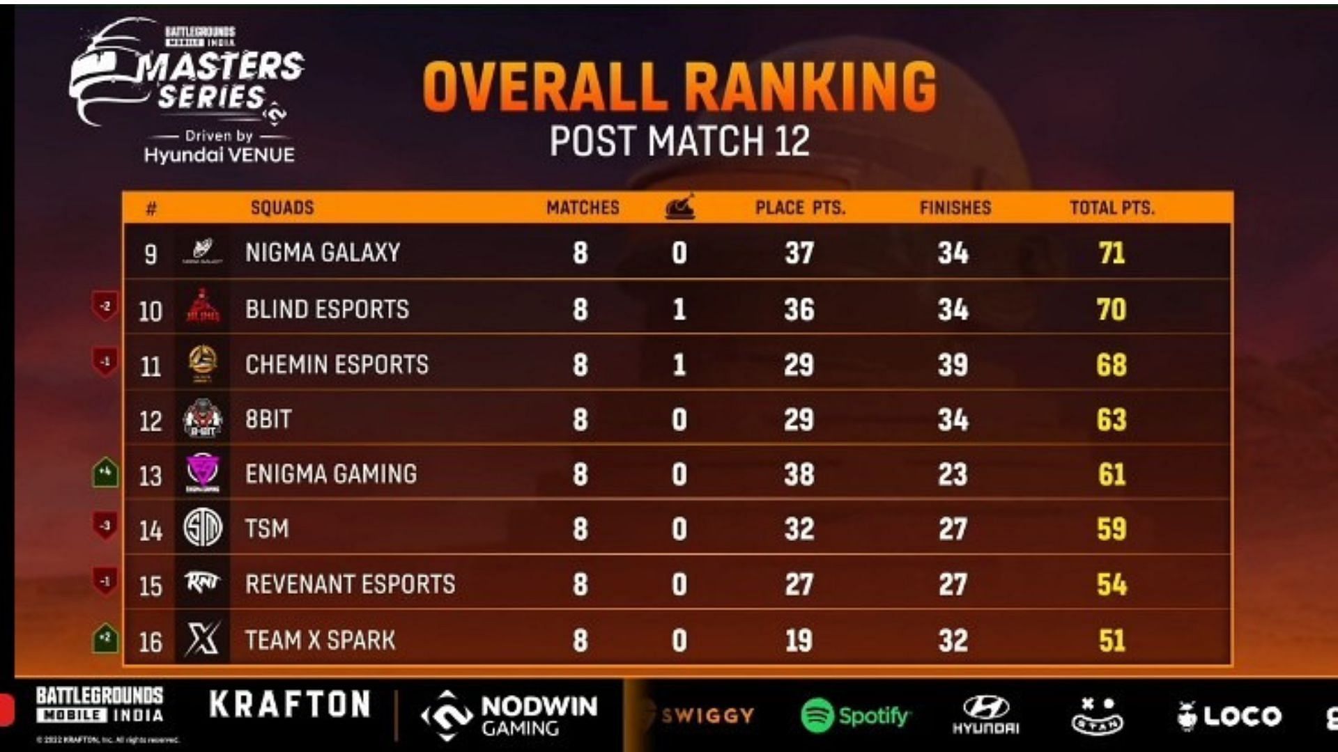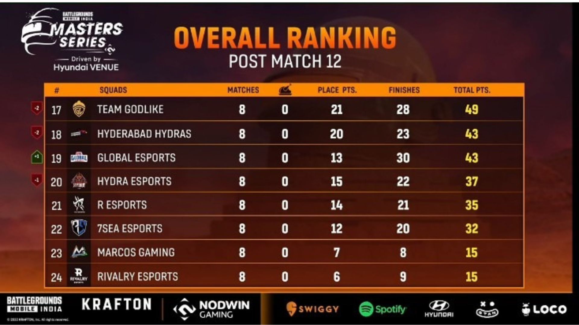 The first week of the BGMI Masters Series 2022 concluded with Skylightz Gaming emerging as the table toppers with 103 points from their eight matches. They earned two chicken dinners today, which propelled them to the pole position. They received four lakhs INR in prize money and also took a Hunger Cure award of 75K INR.