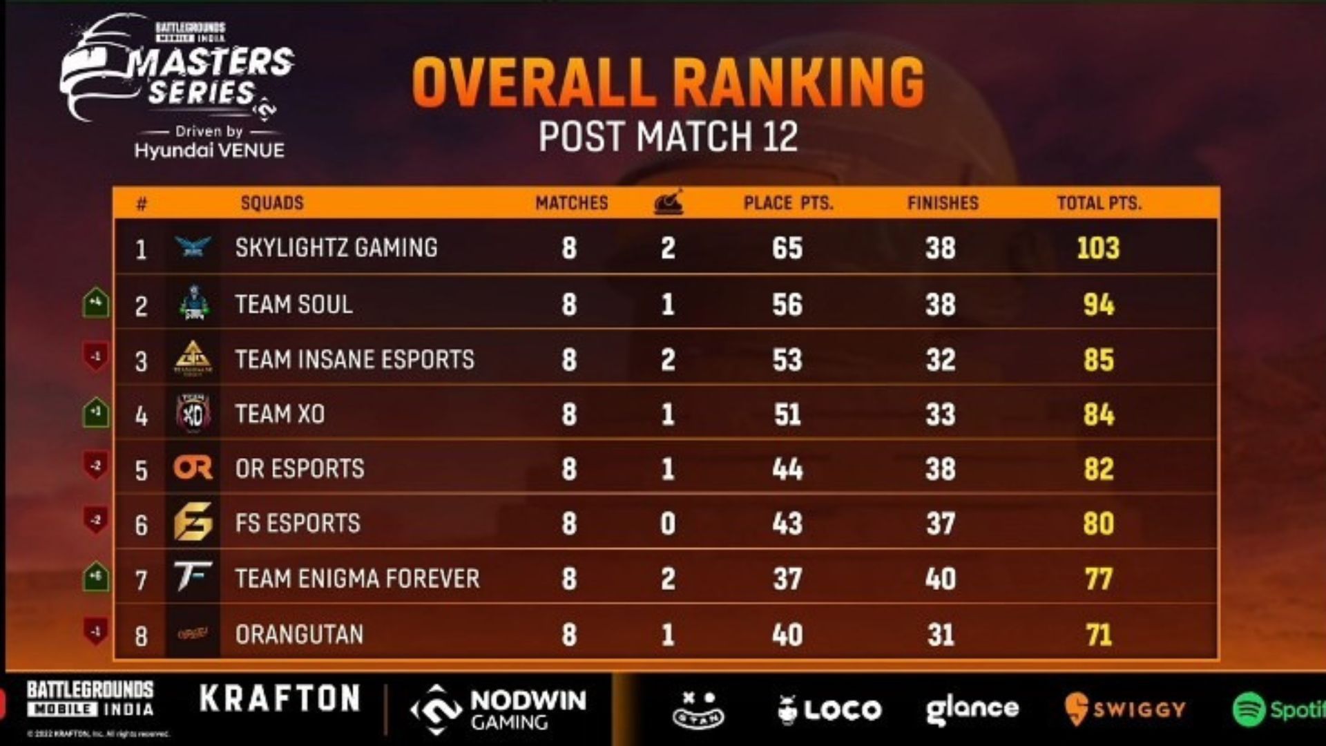 Team Soul finished second with 94 points, with the help of 38 eliminations and a chicken dinner, followed by Team Insane. Team XO and OR Esports claimed fourth and fifth places with 84 and 82 points, respectively. OR Esports's poor performances today saw them drop to the fifth position.