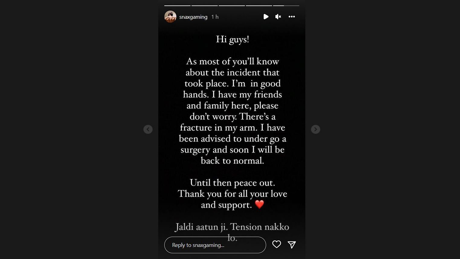 Earlier today, Snax uploaded a story on his Instagram handle, providing an update on his health. He stated that he is "in good hands" as his friends and family are by his side.