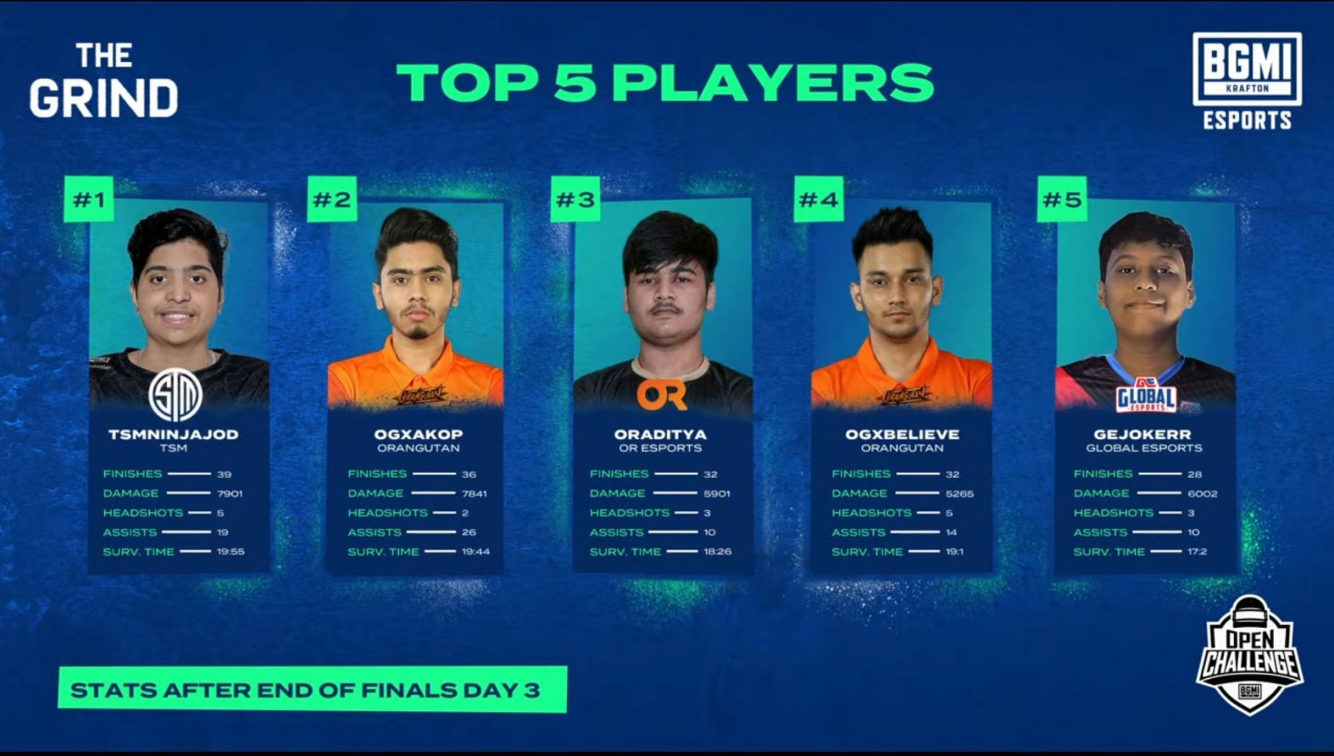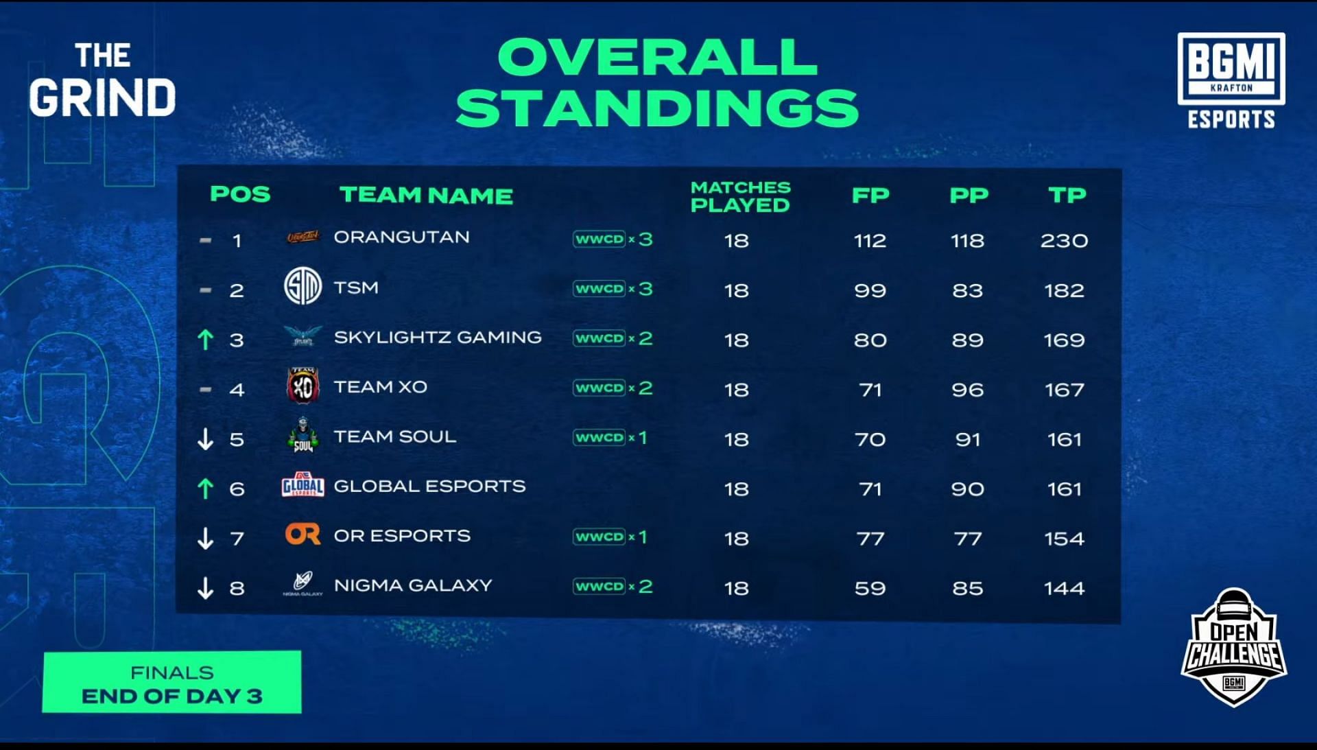 Orangutan Gaming continued their domination in BMOC The Grind finals as they secured first place after day three. The side has collected 230 points, including 112 finishes in their 18 matches. TSM put up an enterprising performance today with a hattrick of chicken dinners and moved up to second place in the overall standings.