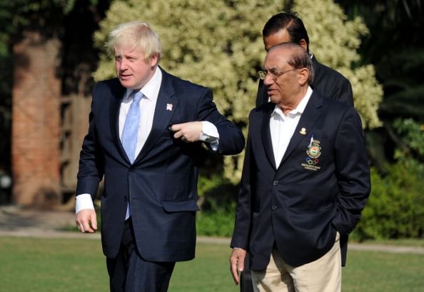 Mayor of London Boris Johnson (L) along with the President of the Indian Olympic Association Vijay Kumar Malhotra (R)