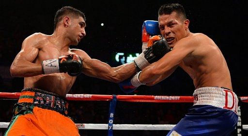 Julio Diaz lands a clubbing left-hander to the jaw of Amir Khan on April 27, 2013 in Sheffield. Khan admits he will have to spend more time with his trainer Virgil Hunter in San Francisco after being floored on his way to a 12-round points win.