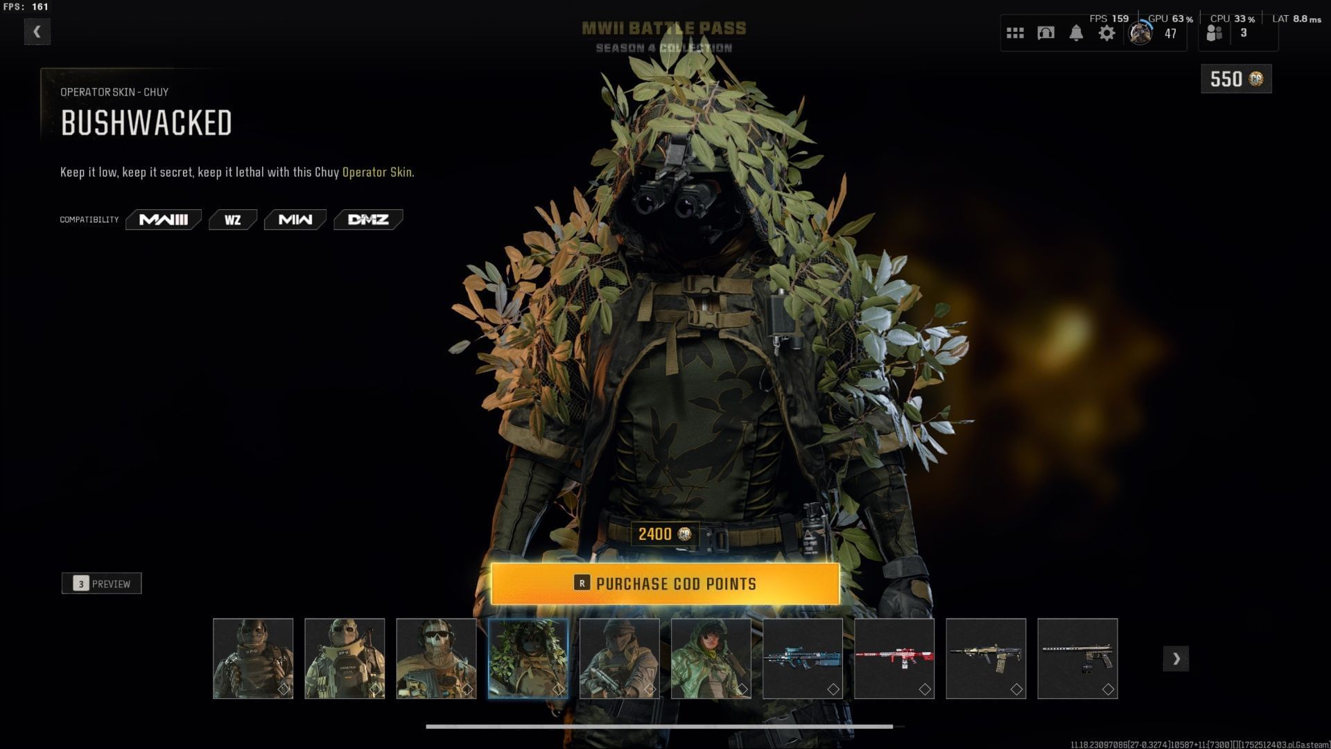 The bundle costs 2,400 Call of Duty Points (CP), which is approximately $19.99. Once purchased, the Bushwacked skin will be available in your inventory, and you can equip it to start using it in matches.