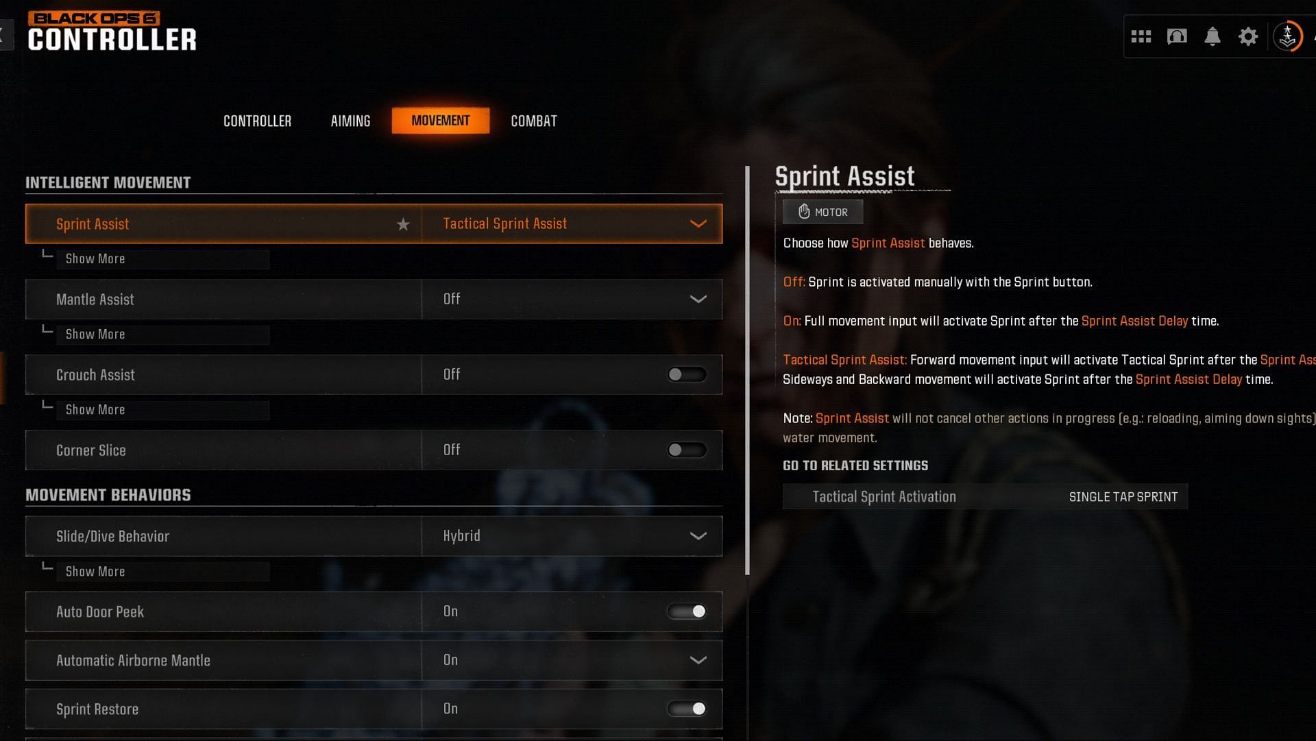 To keep up with the fast-paced nature of the game, Tactical Sprint Assist should be enabled and Sprint Assist Delay set to zero. These settings allow you to reach maximum speed instantly whenever needed. Additionally, enabling both Sprint Assist Sideways and Backwards gives you full movement freedom, allowing you to sprint in any direction without hindrance.