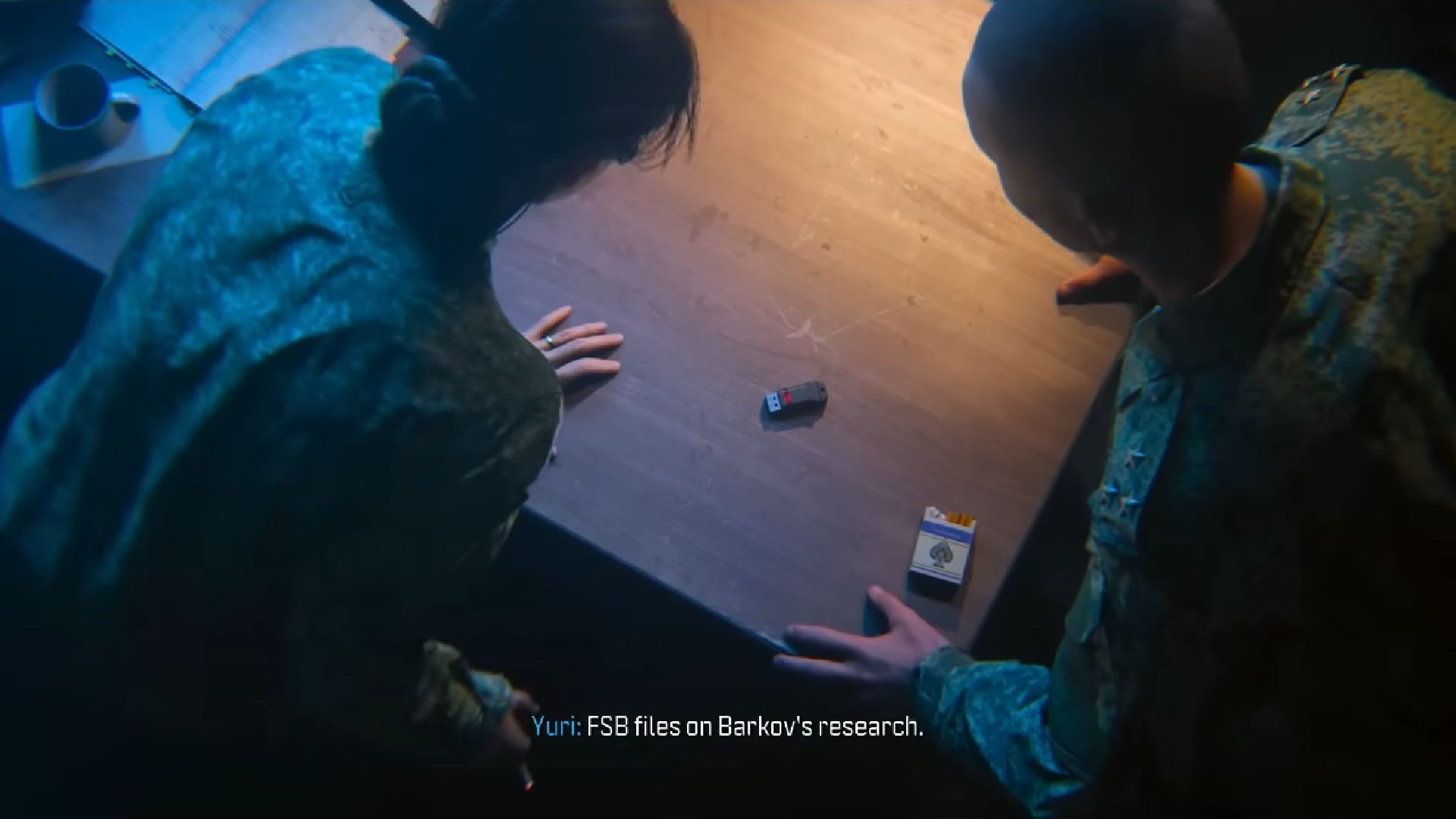 You can now use the keycard to enter the administrative block. You will need to follow Nikolai’s direction and enter a dark room in the ground floor hallway. A cinematic will start playing, showcasing a discussion between Yuri and Laswell, where he provides you with a USB drive containing information on the Toxic gases that were taken by Makarov.
