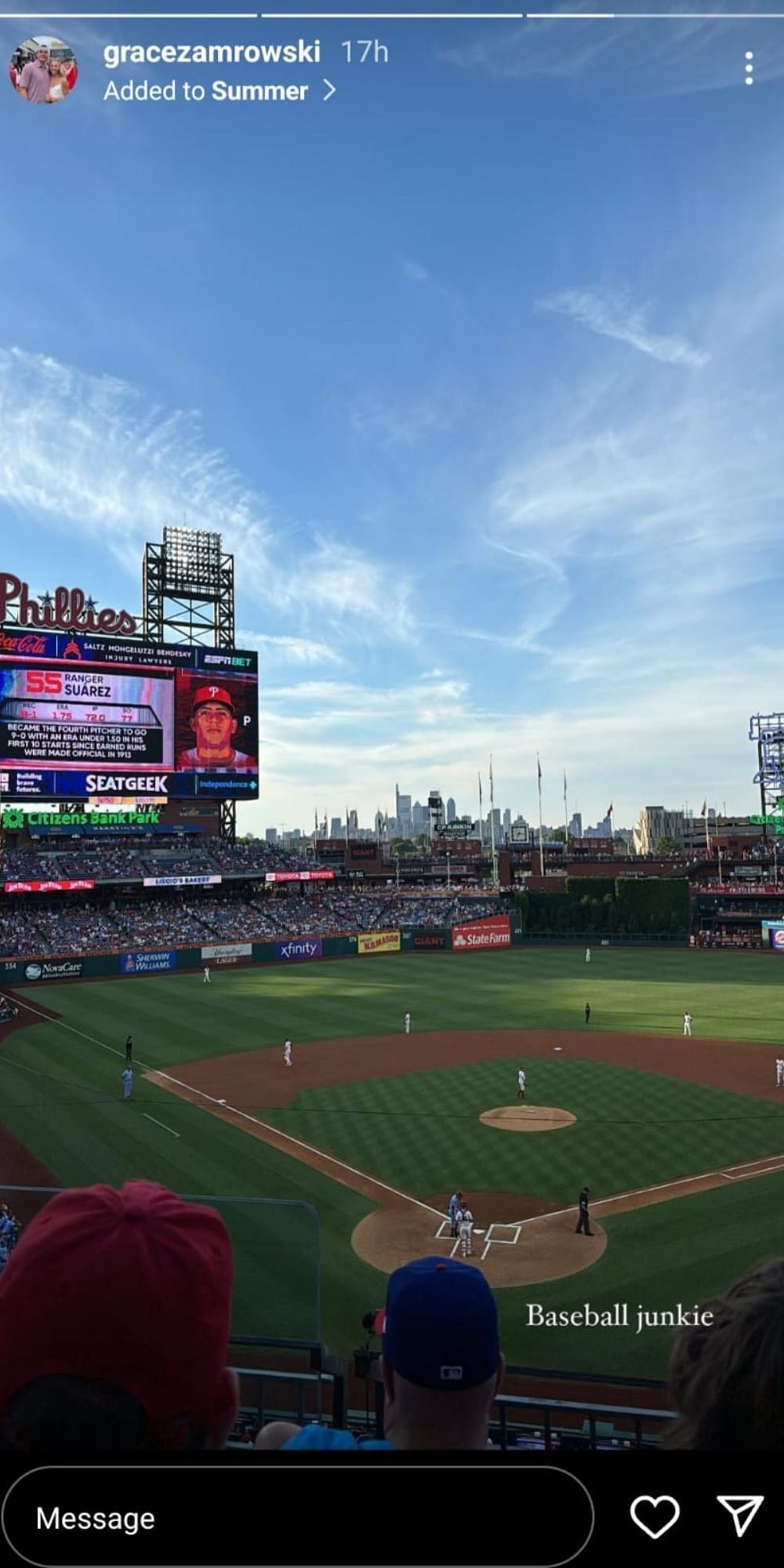 Ethan Petry's girlfriend Grace Zamrowski declared herself a baseball junkie earlier this month. She was there to support the Philadelphia Phillies during their series against the St. Louis Cardinals. Wearing a Phillies top, she cheered for the team from the stands at the Citizens Bank Park. She posted an Instagram story of the game with "Baseball Junkie" written on it.