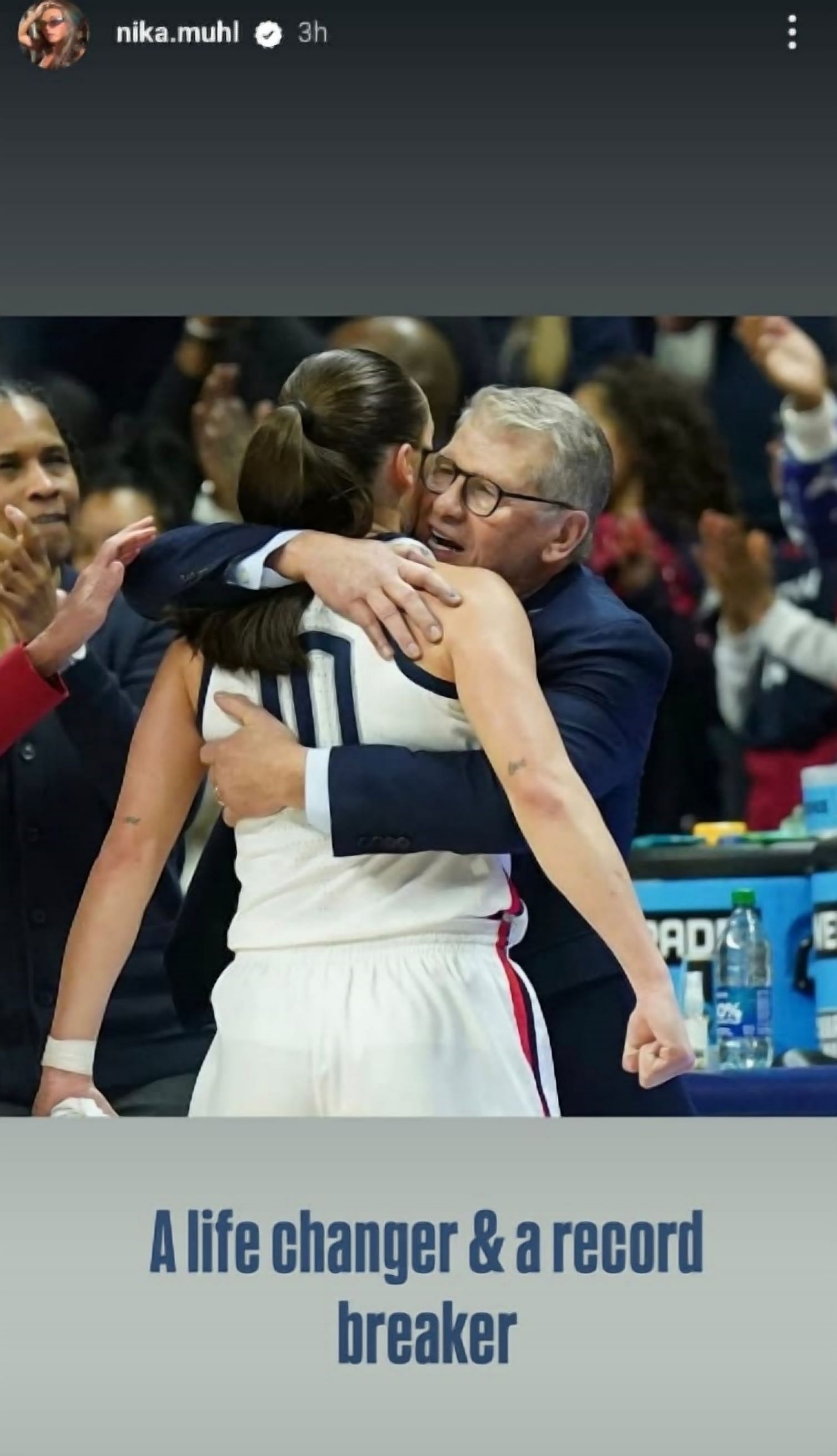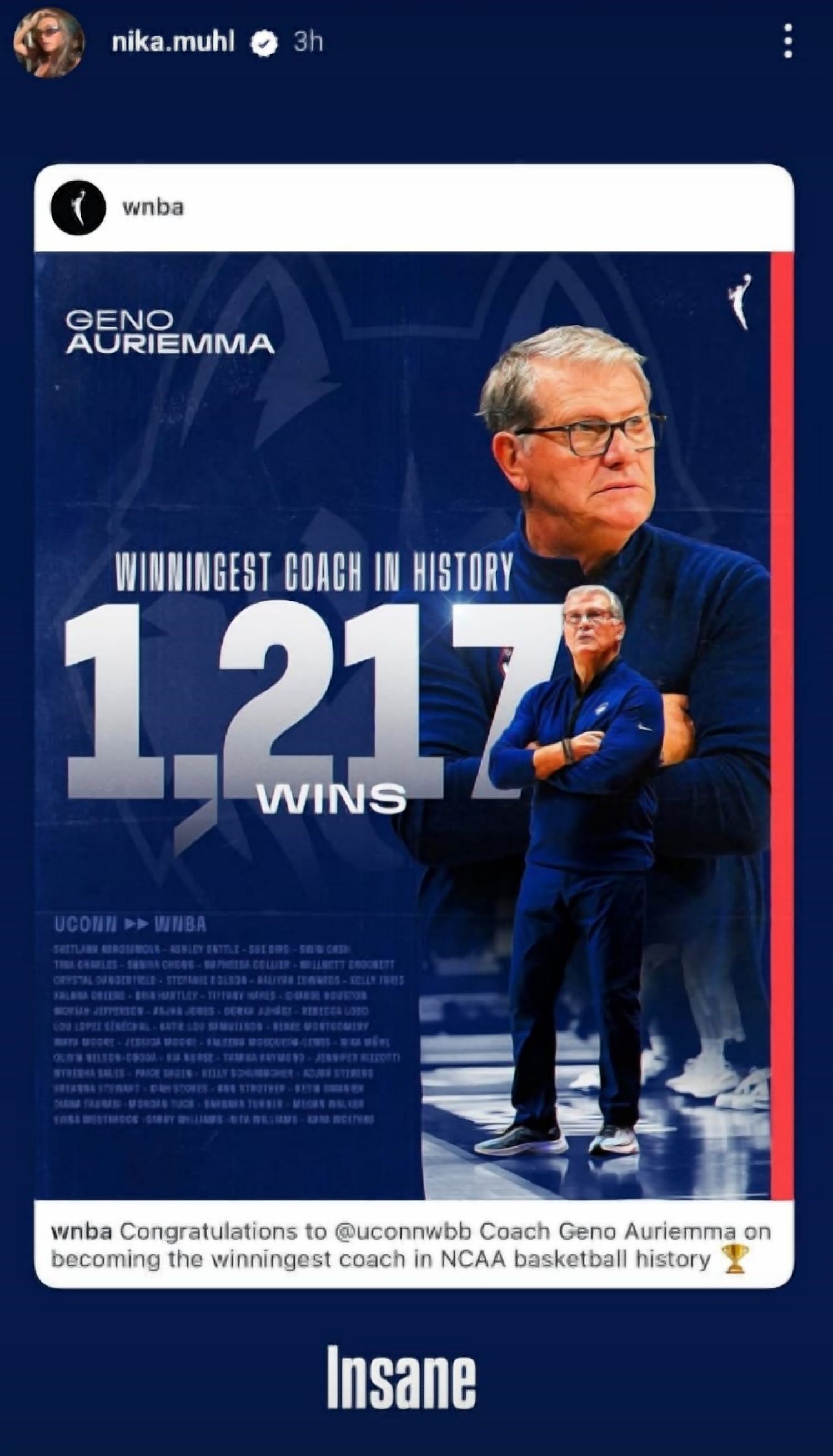 She shared another story, reposting a WNBA stat graphic highlighting Auriemma's 1,217 career wins. Mühl added a comment to the post, calling the milestone "Insane."