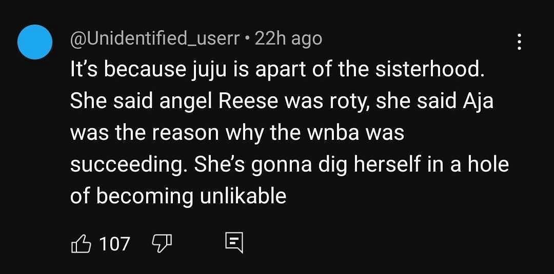 "It’s because juju is apart of the sisterhood. She said angel Reese was roty, she said Aja was the reason why the wnba was succeeding. She’s gonna dig herself in a hole of becoming unlikable," one explained.