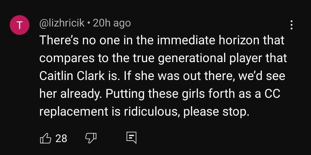 "There’s no one in the immediate horizon that compares to the true generational player that Caitlin Clark is. If she was out there, we’d see her already. Putting these girls forth as a CC replacement is ridiculous, please stop," one fan stated.