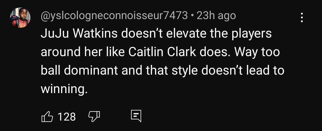 "JuJu Watkins doesn’t elevate the players around her like Caitlin Clark does. Way too ball dominant and that style doesn’t lead to winning," one fan said.