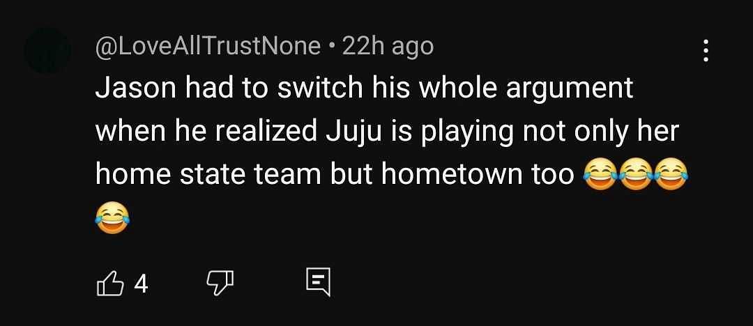 "Jason had to switch his whole argument when he realized Juju is playing not only her home state team but hometown too," a fan remarked.