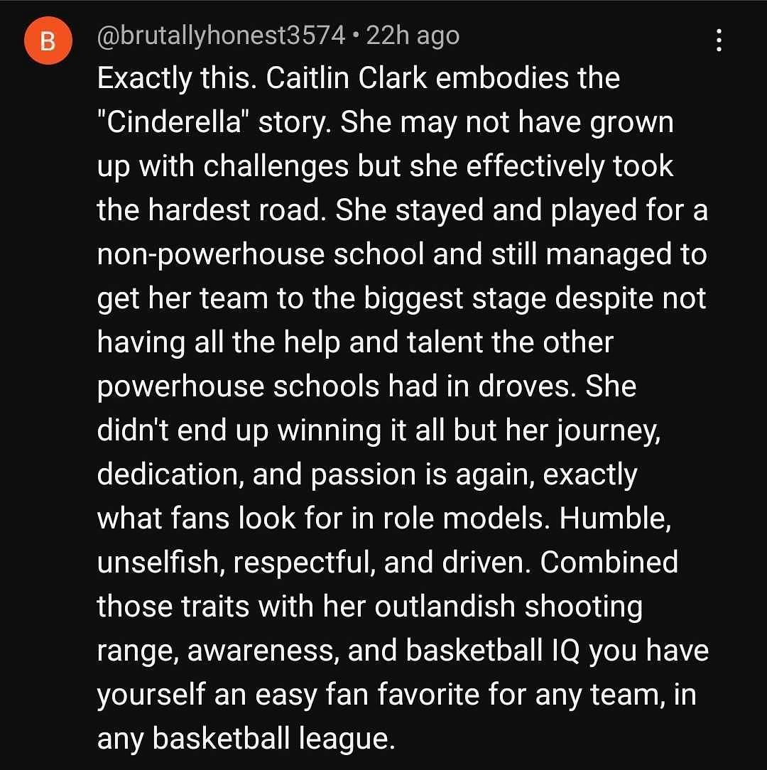 "Exactly this. Caitlin Clark embodies the 'Cinderella' story. She may not have grown up with challenges but she effectively took the hardest road. She stayed and played for a non-powerhouse school and still managed to get her team to the biggest stage despite not having all the help and talent the other powerhouse schools had in droves ... ," one explained.