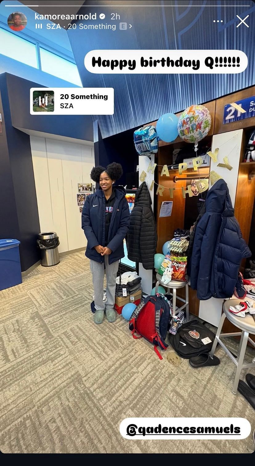 UConn Huskies’ Kamorea Arnold took to Instagram to celebrate her teammate Qadence Samuels’ birthday, sending her birthday wishes. Arnold shared a heartfelt post on Friday, complete with a festive photo of Samuels standing by a decorated locker. In the picture, Samuels is surrounded by balloons, banners, and snacks, creating a cheerful birthday atmosphere.