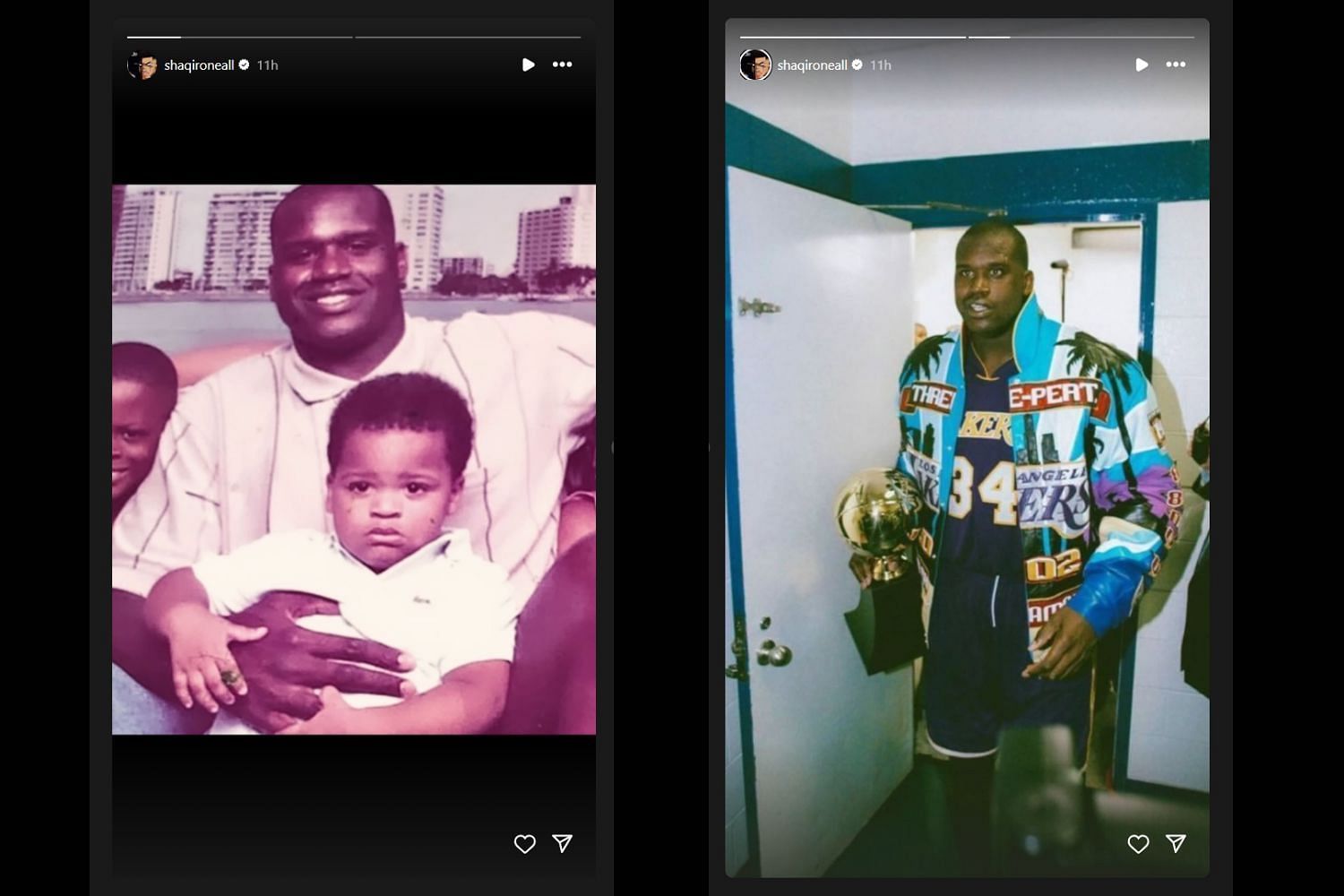 The first image showed Shaqir as a young boy sitting on Shaquille's lap during the NBA superstar's playing days. The next photo was an iconic one from when Shaq completed a three-peat with the LA Lakers in 2002, holding his Finals MVP trophy.
