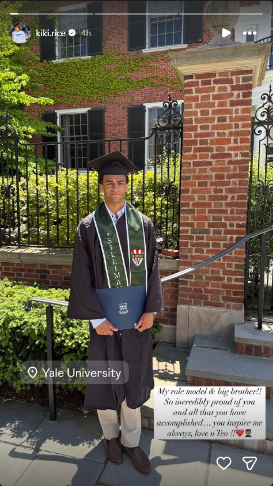Star guard Kiki Rice took a break from offseason workouts to celebrate a major family milestone on Monday. The UCLA guard's brother, Teo Rice, had graduated from Yale, and she posted an image of her sibling in academic regalia at the university campus, posing after the ceremony.